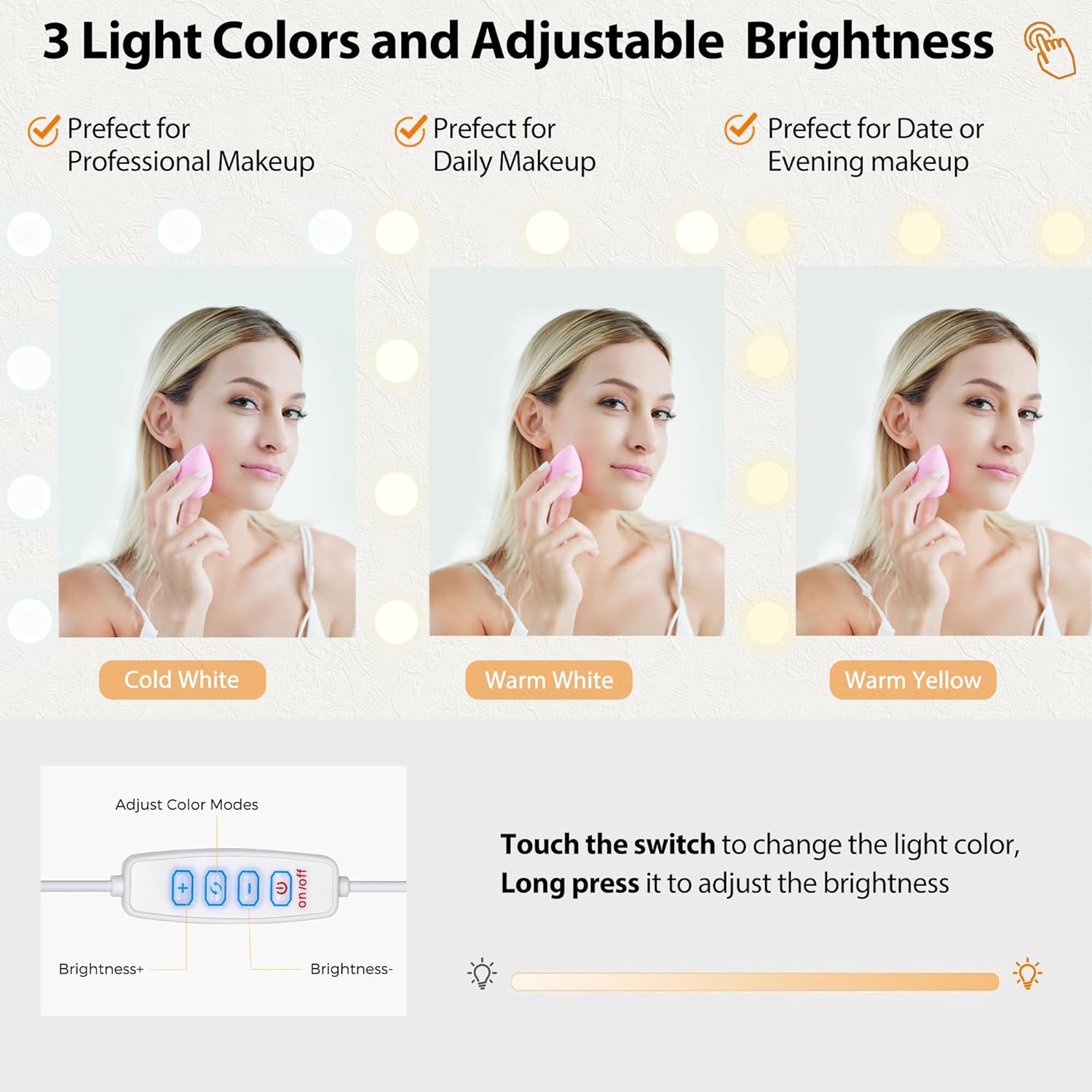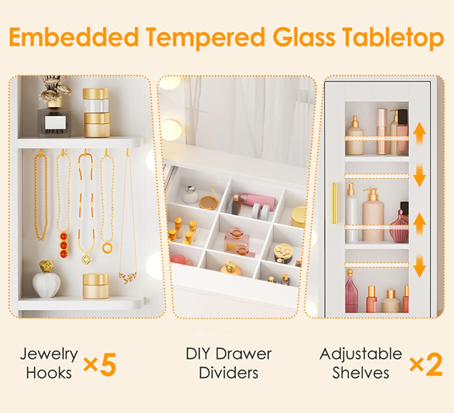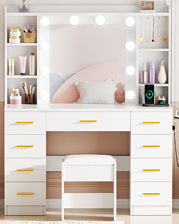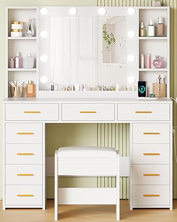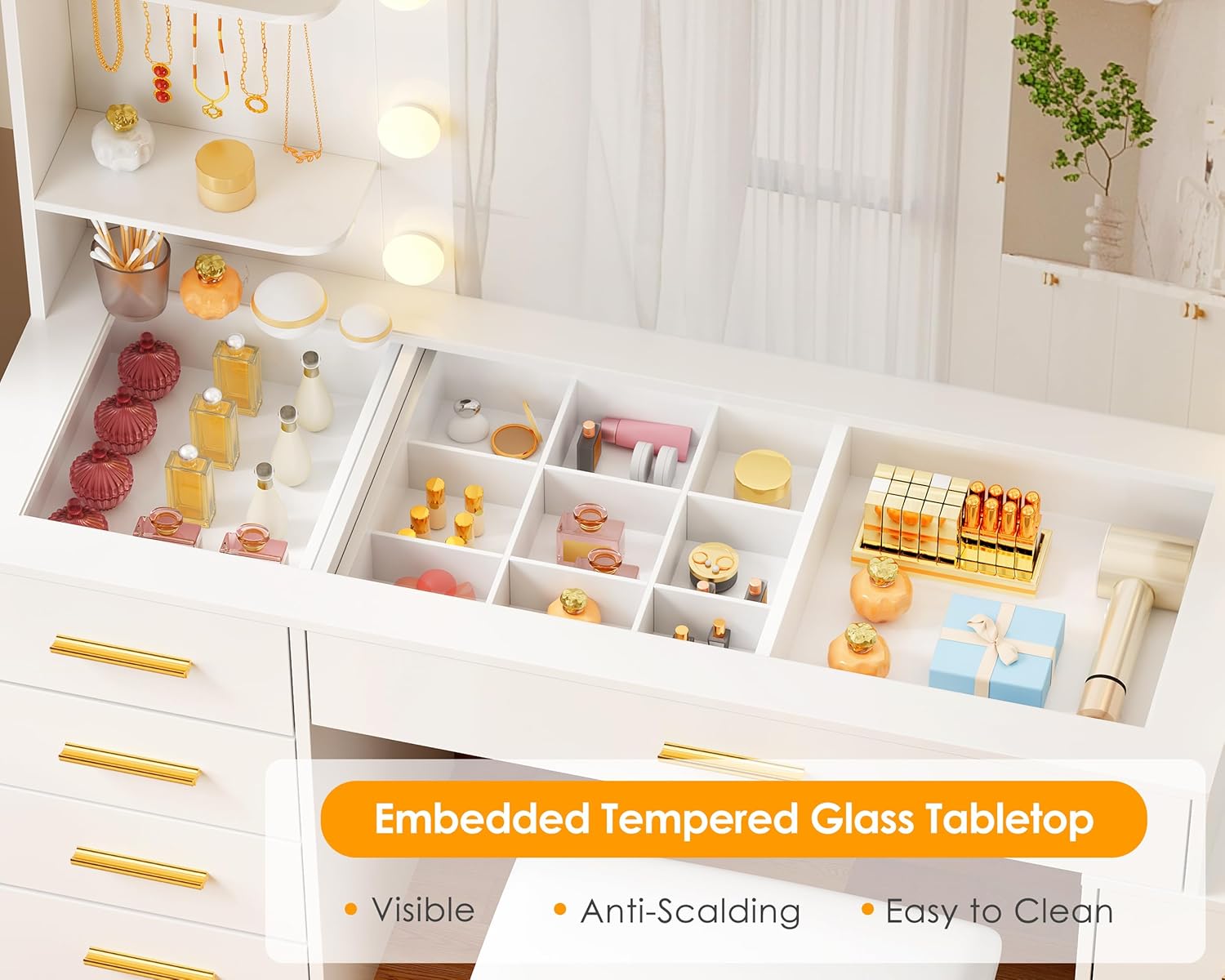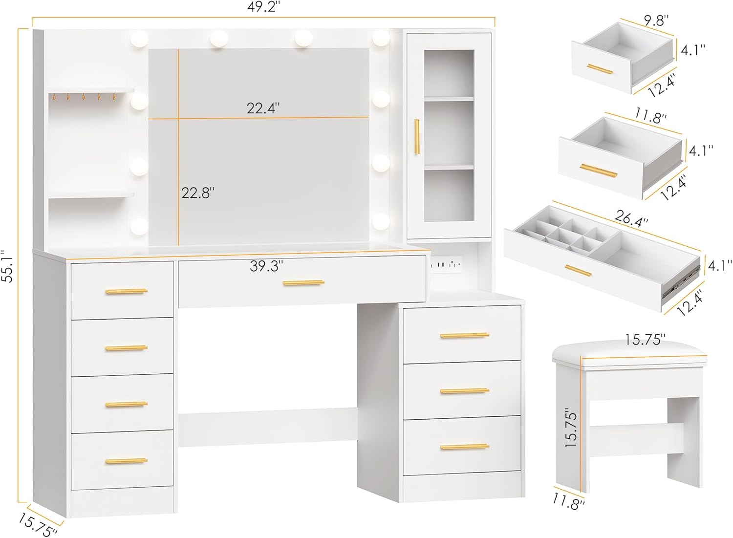 ANWBROAD 49.2" Large Vanity Desk with Mirror and Lights White Makeup Vanity Desk with Glass Top and Power Outlet 8 Drawers Nightstand 5 Hooks Vanity Table with Stool for Bedroom Women Girls UBDT88W