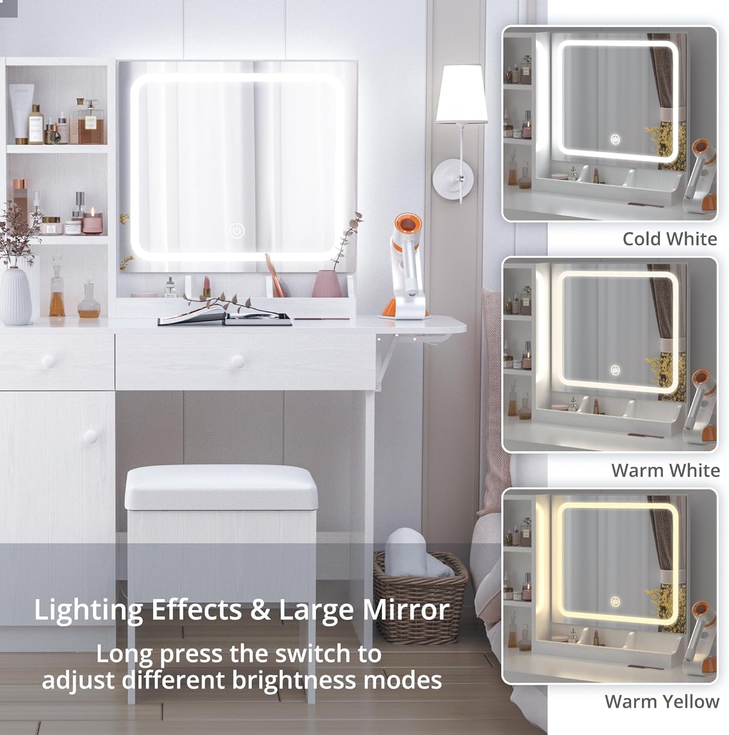 IRONCK Vanity Desk with LED Lighted Mirror & Power Outlet, Makeup Table with Drawers & Cabinet,Storage Stool, White