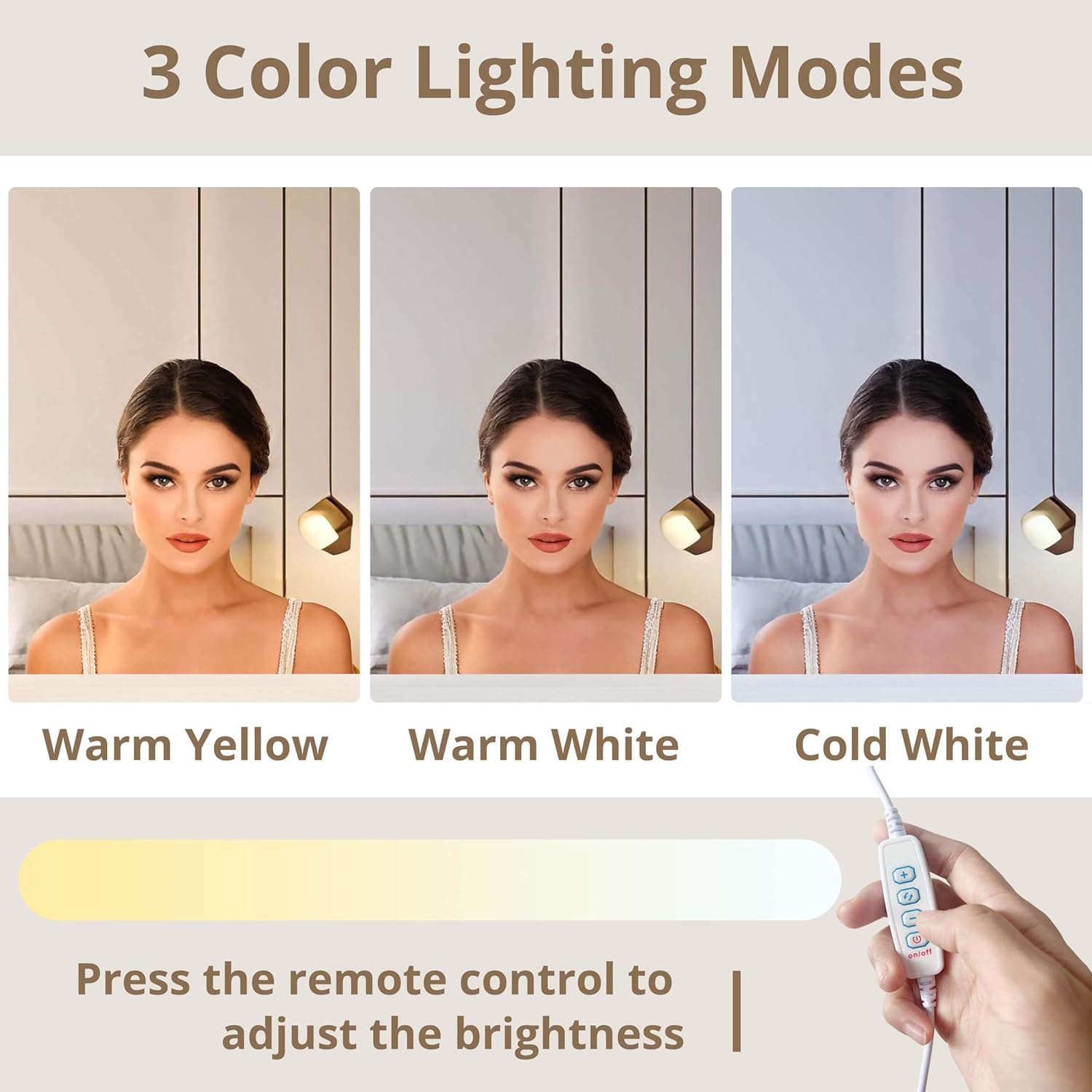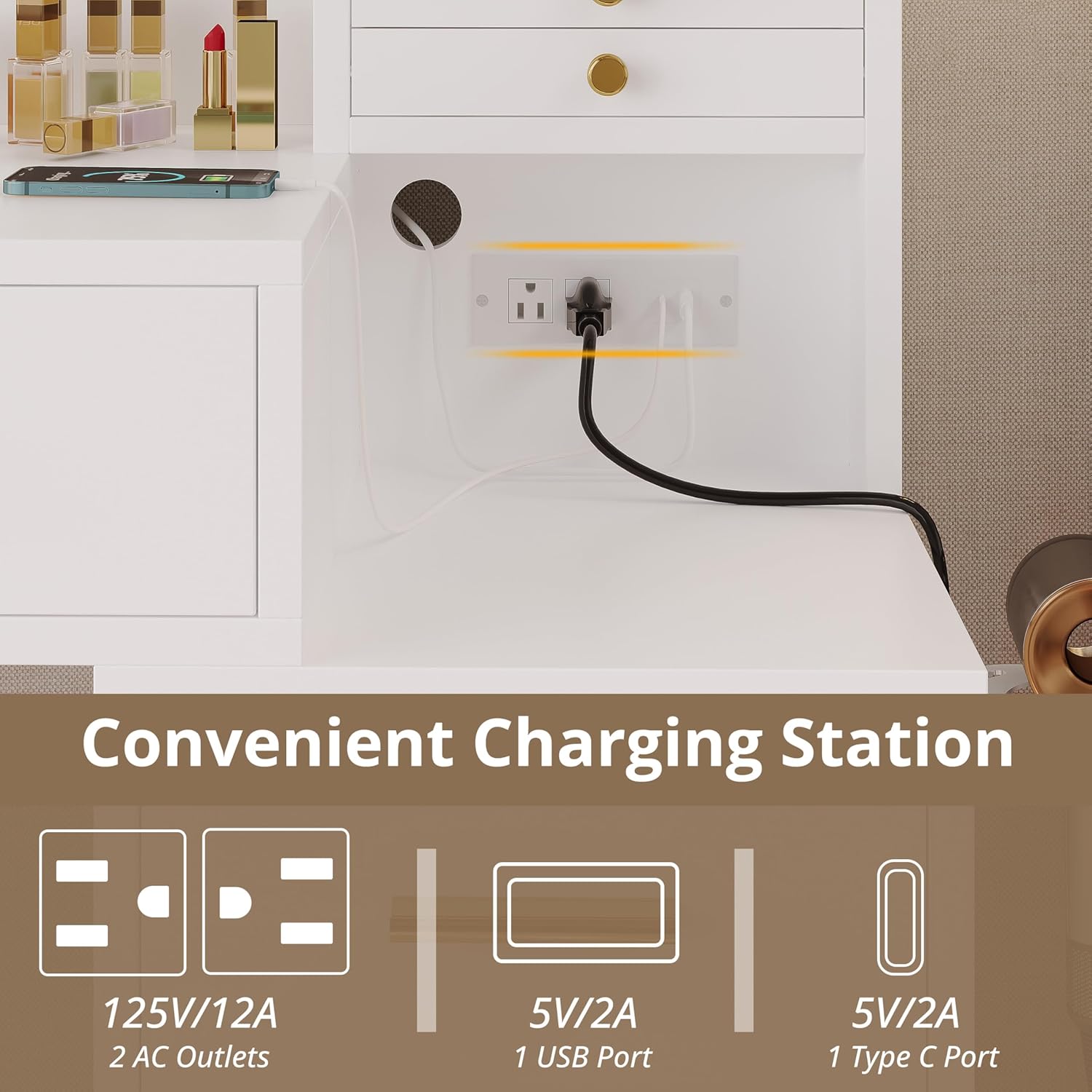 IRONCK Vanity Desk with Mirror and Lights, Makeup Vanity Table with 5 Drawers & Shelves, Power Outlet, Vanity Stool, Dressing Table with Jewelry Storage for Bedroom, White & Gold
