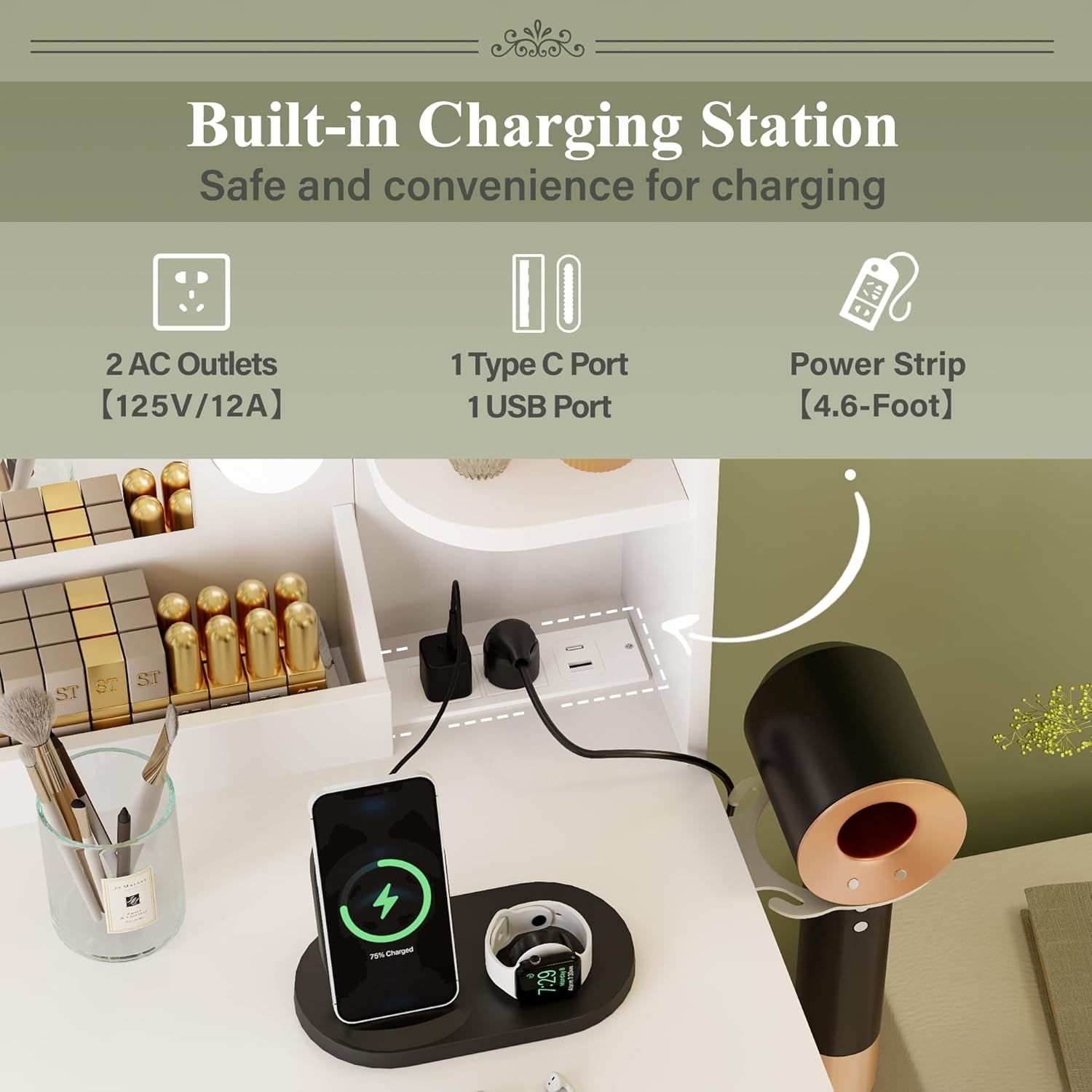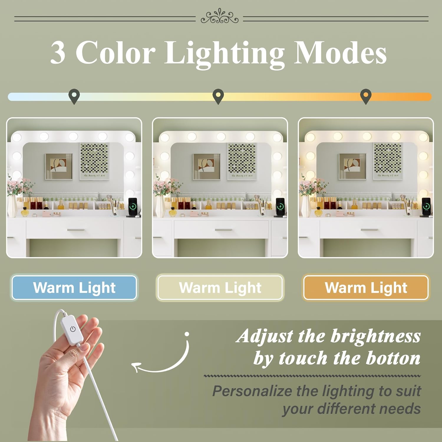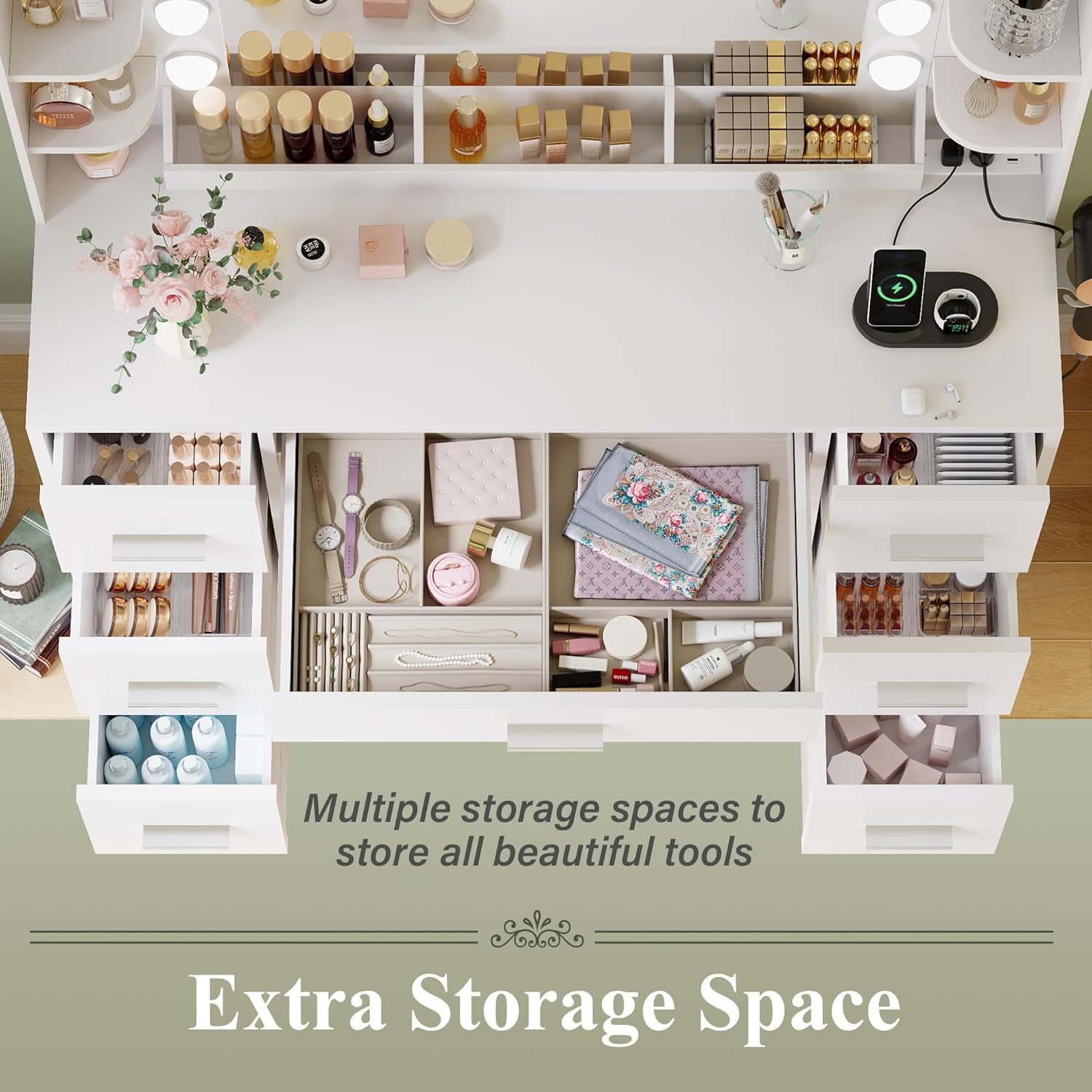 JUMMICO Makeup Vanity Desk with Large Mirror and Lights, Vanity with Power Strip and Hairdryer Holder, 6 Open Shelves and 7 Drawers Modern Dressing Table, for Bedroom (White)