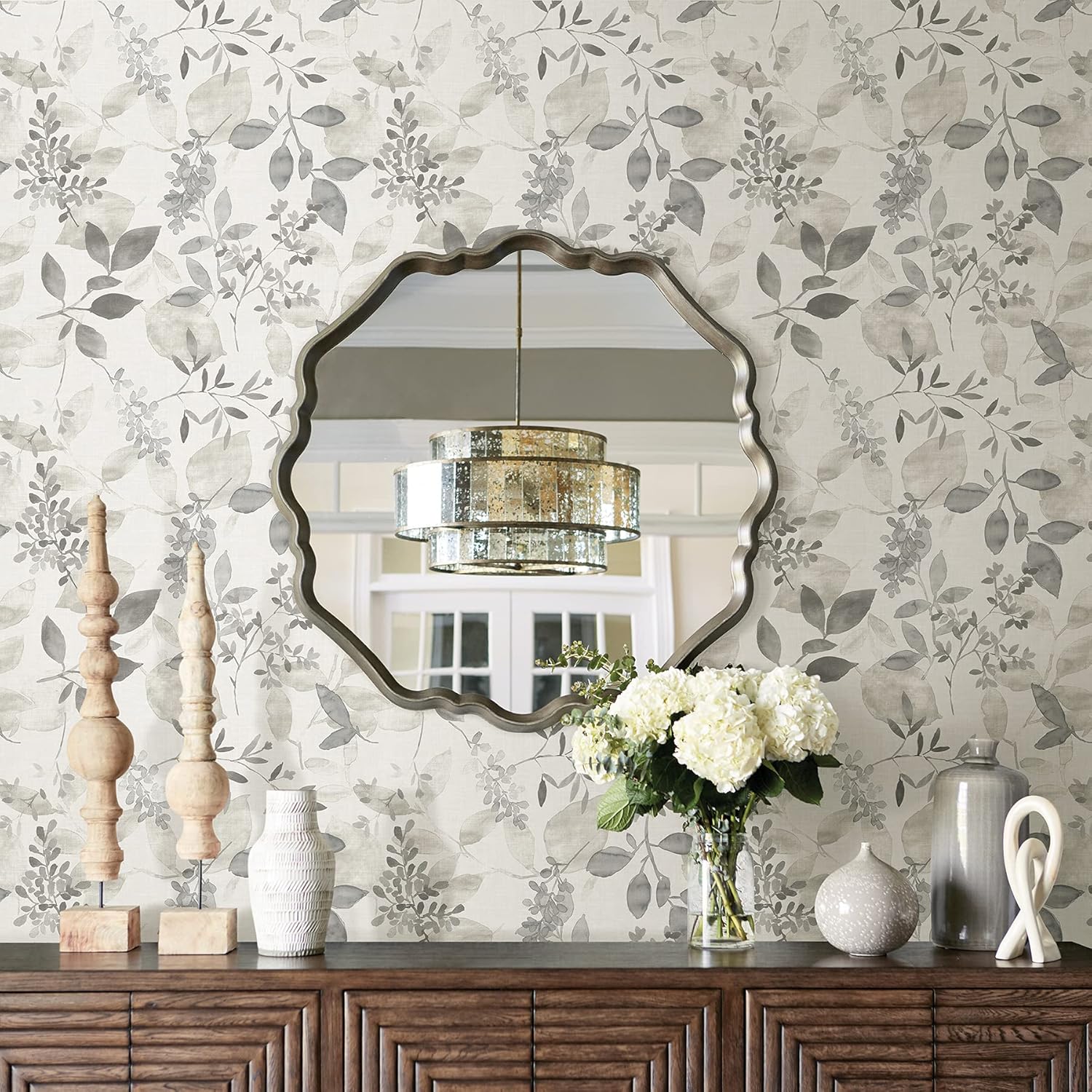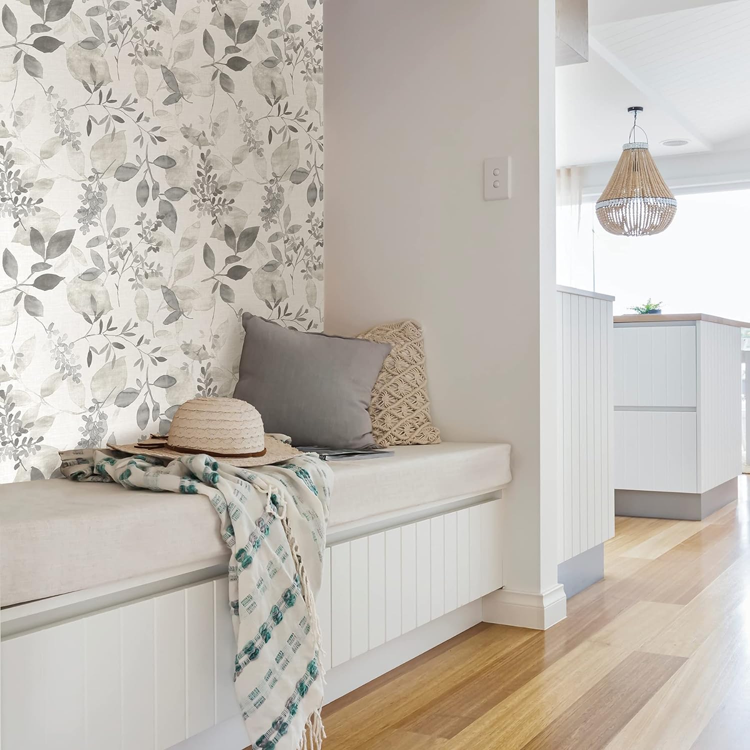 With a breezy watercolor design, this botanical wallpaper has a ethereal vibe. Grey and neutral leaves will add a serene feel to rooms. Grey Breezy Peel and Stick Wallpaper comes on one roll that measures 20. 5 inches wide by 18 feet long.