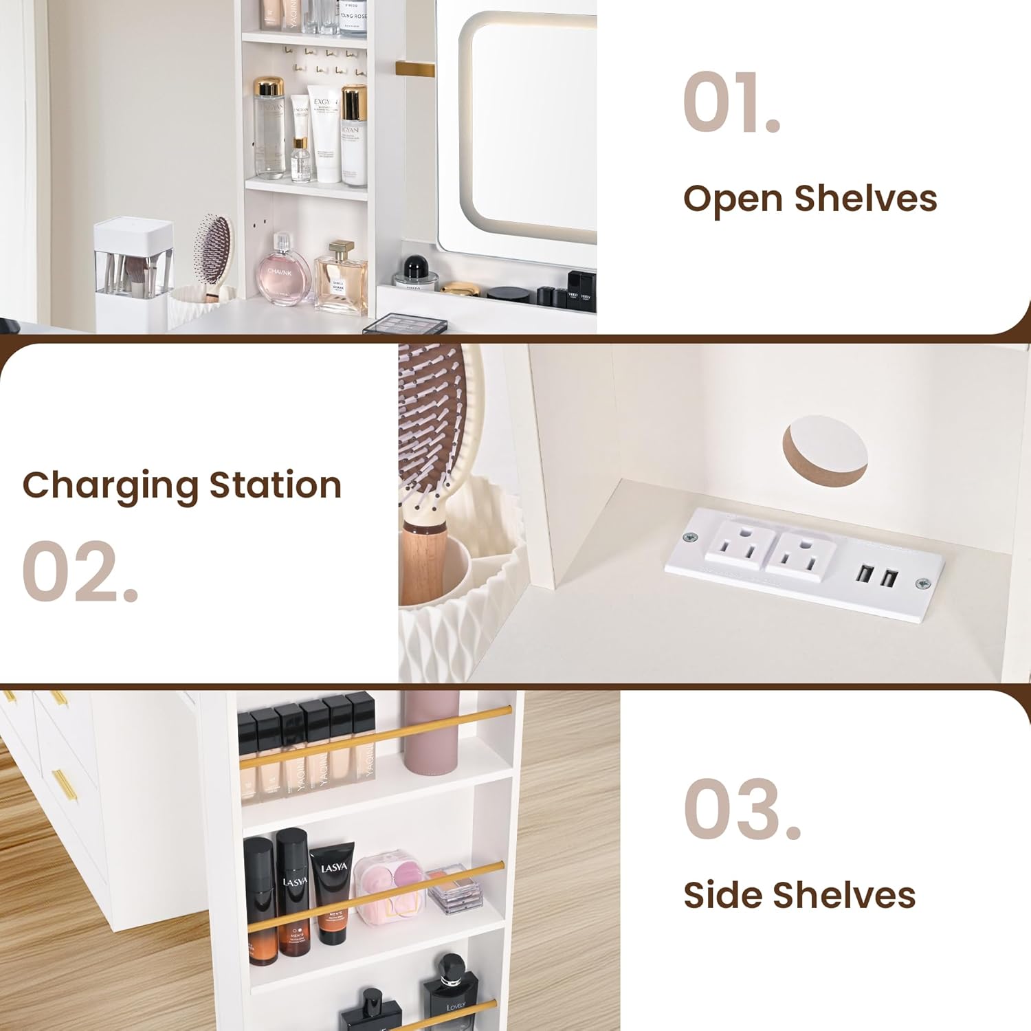 Pamapic 8 Drawers Makeup Vanity with Mirror and Lights, 15 Storage Vanity Desk with Power Outlet, Golden Handles Dresser with Mirror,Adjustable Width, White Dressing Table