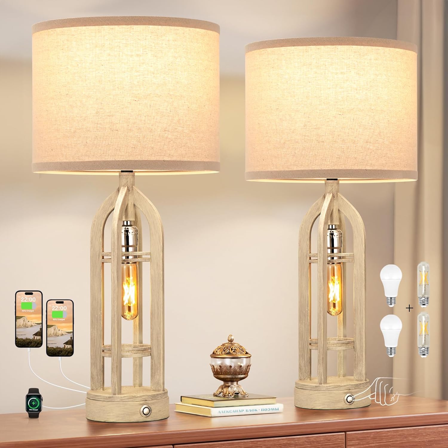 Seealle Table Lamps for Living Room Set of 2 - Black Bedside Lamp for Bedroom with USB C+A & Outlet, Farmhouse Lamps for Night Stands, 3-Way Dimmable Touch Lamps for Living Room with Oat Shade