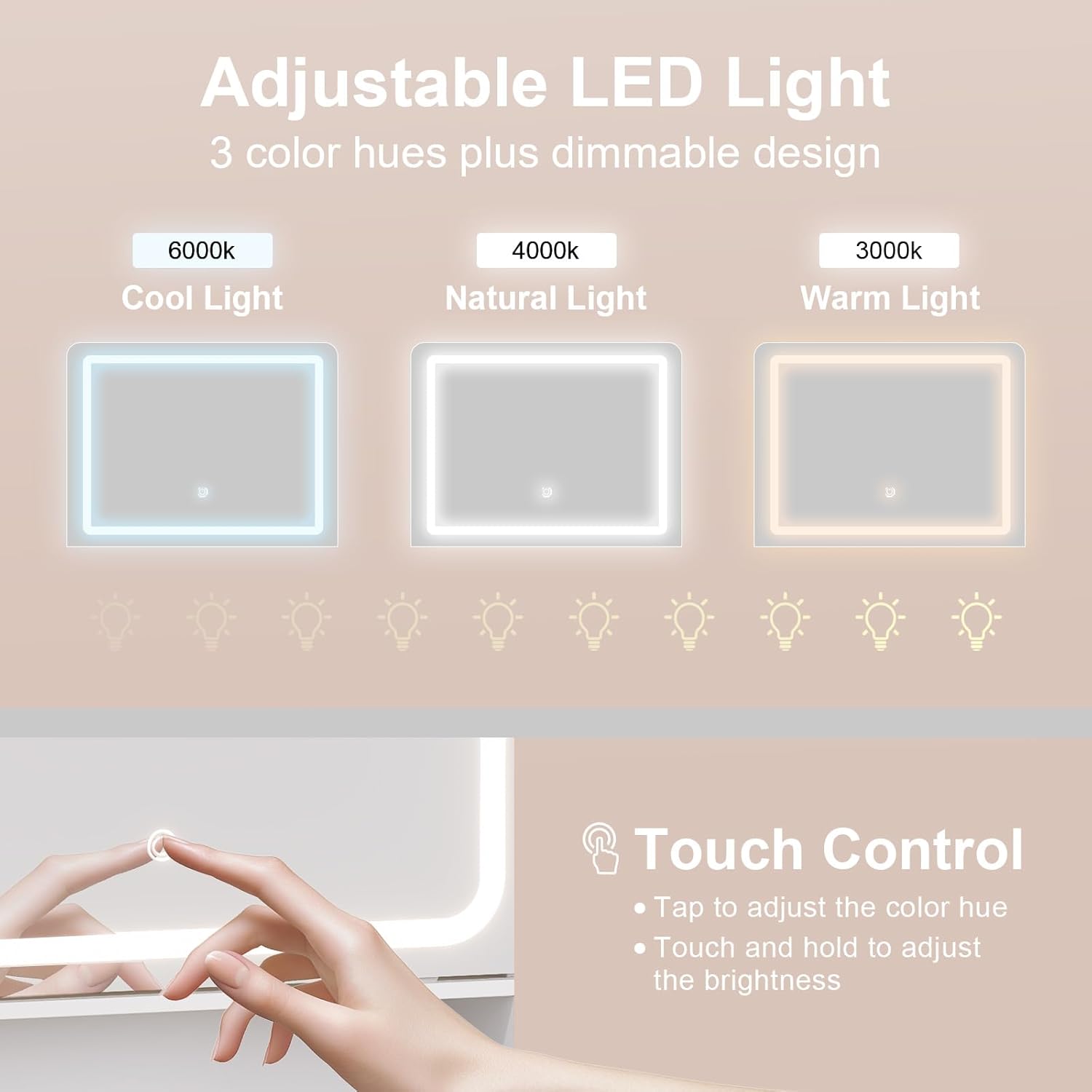 This lighted vanity set offers powerful storage with a top shelf, 4 open shelves, 2 drawers (1 large, 1 small), and a storage cabinet, perfect for organizing all your beauty essentials from lipsticks and perfumes to skincare and jewelry. It also features 2 outlets and 2 USB connections, so you can easily charge your devices while styling your hair or getting ready. The built-in mirror with adjustable LED lighting offers 3 customizable modes, helping you create the ideal lighting for your beauty routine. Additionally, the set includes a stylish upholstered stool with hidden storage, blending elegance and practicality while adding a chic touch to your bedroom. This vanity doubles as a multipurpose workstation, transforming any space into your personal beauty station.